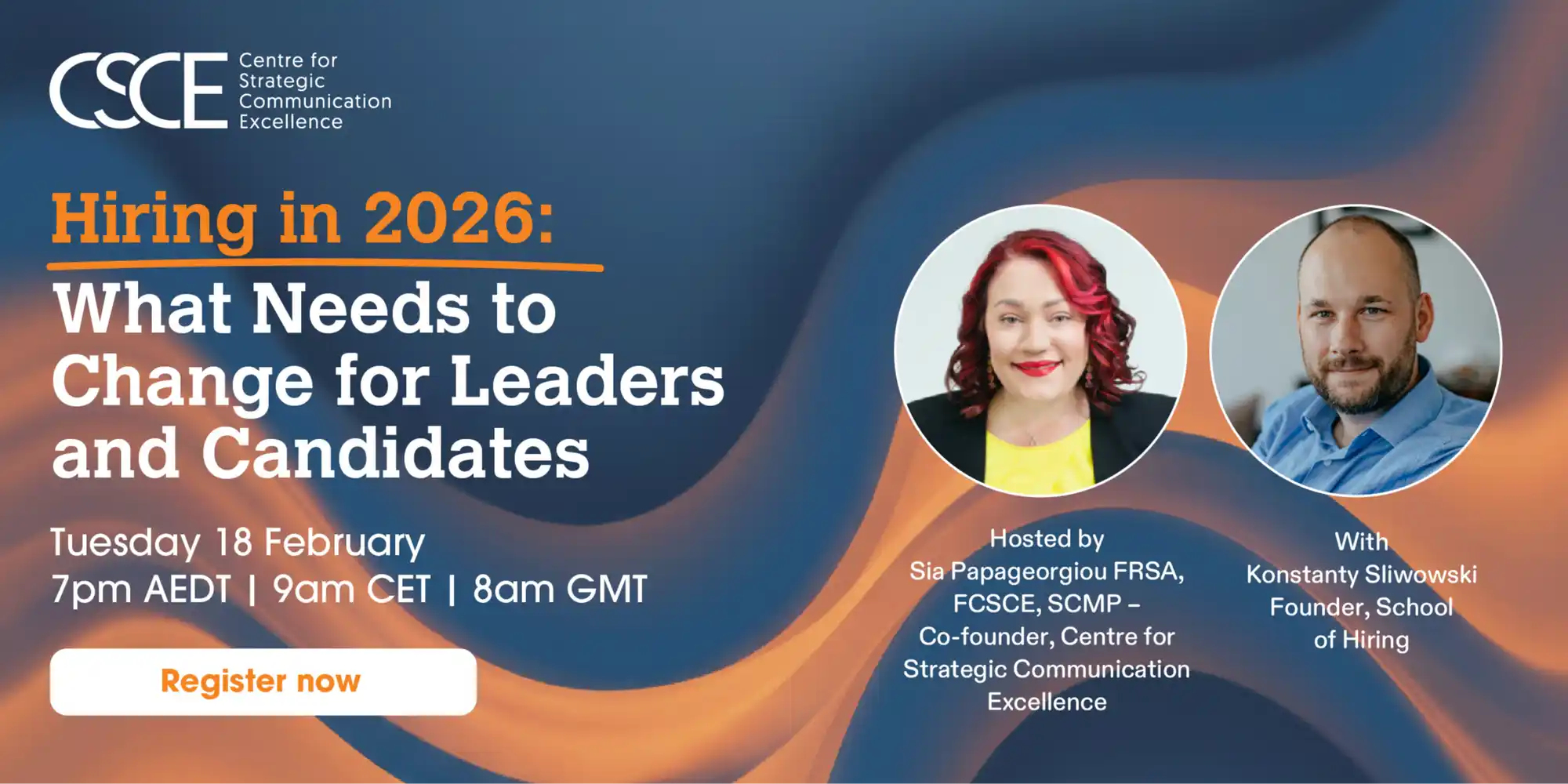 This event is for anyone involved in hiring, being hired, or shaping senior roles where judgement, influence and experience matter. Whether you’re a communication professional navigating complex career decisions, a leader responsible for hiring capability, or someone questioning how talent is assessed, you’ll gain sharp insights into what’s being misread in modern recruitment. If you care about fairer decisions, stronger leadership and hiring practices that genuinely value experience — this conversation is for you.