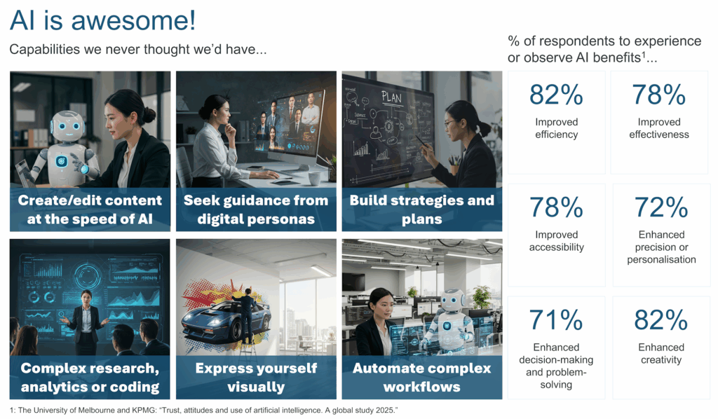 As most of us know by now, AI is an unbelievable enabler. As the image below shows, it gives all of us capabilities we never thought we’d have, while helping us overcome any skill gaps we have.