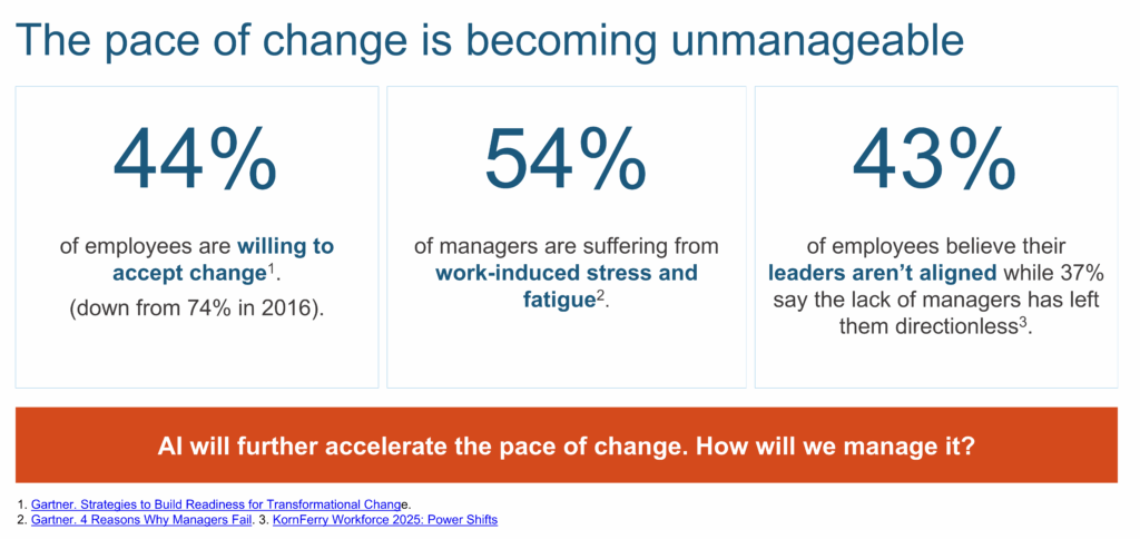 In case you haven’t noticed, we’re well and truly there, as evidenced by the data below. Our willingness to accept change is way down. The rates of work-induced stress and fatigue are growing. And organisational alignment is fracturing under the weight of constant transformation.